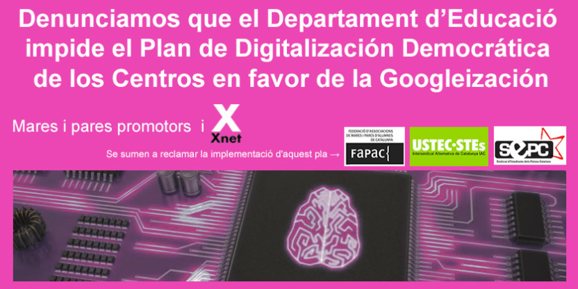 Aquí el plan pormenorizado que hemos presentado al Departamento de Educación de la Generalitat según acuerdo (https://xnet-x.net/privacidad-datos-digitalizacion-democratica-educacion-sin-google/) tras un año de conversaciones para que lleve a cabo una digitalización democrática de los centros educativos con servidores seguros, entornos de trabajo colaborativo (paquetes educativos) auditables y capacitación digital puntera, y tras una crisis pandémica que ha ratificado las advertencias y la emergencia digital que veníamos anunciando desde septiembre de 2019.