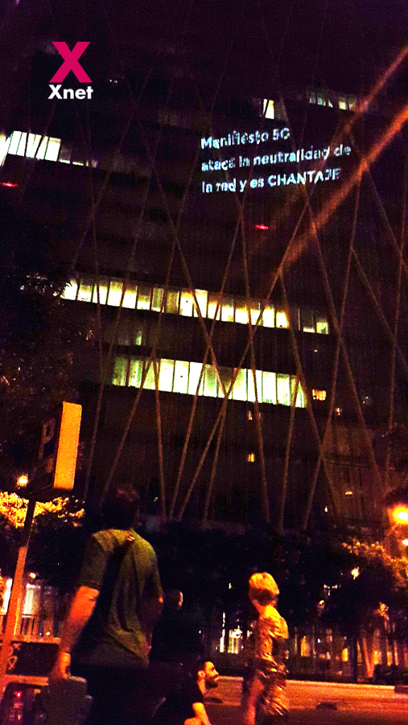 En Barcelona, Xnet hemos llevado el debate a la calle proyectado en la fachada de las oficinas de Telefónica mensajes pro-neutralidad de la red.
